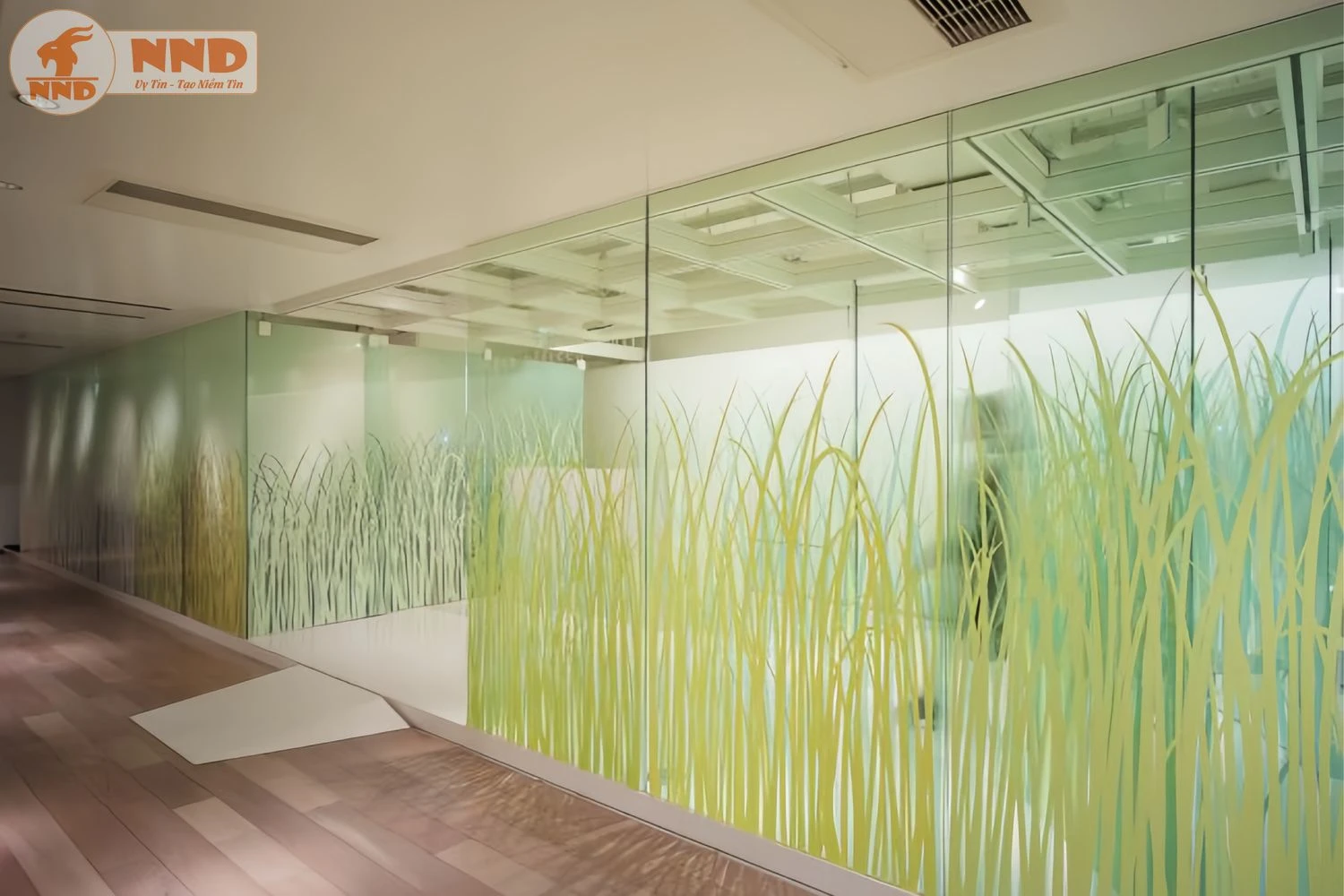 Một thiết kế nghệ thuật biến hành lang thành cánh đồng lúa trải dài. Kỹ thuật in màu lên decal trong tạo hiệu ứng chiều sâu, giúp không gian có cảm giác rộng mở và thư thái hơn. Đây là giải pháp hoàn hảo để mang thiên nhiên và sự độc đáo vào các khu vực hẹp.