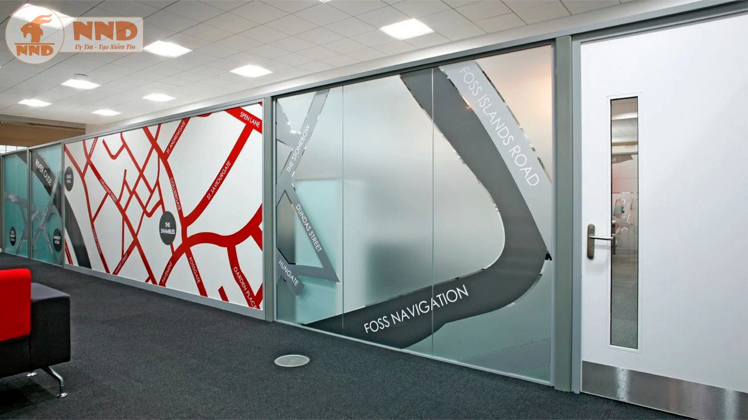 Một thiết kế đầy sáng tạo, biến mỗi phòng họp thành một “thành phố” riêng. Sử dụng kết hợp decal trong suốt cắt line-art hình ảnh biểu tượng của thành phố, và decal màu để tạo nền và tên gọi.