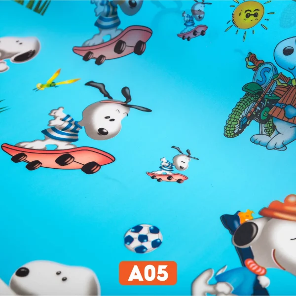 - Họa tiết chú chó Snoopy tinh nghịch: Thiết kế là một bức tranh sống động với hình ảnh chú chó Snoopy đáng yêu đang tham gia các hoạt động thể thao như trượt ván, đá bóng, lái xe… trên nền xanh da trời tươi sáng, mang lại cảm giác vui nhộn và tràn đầy năng lượng.