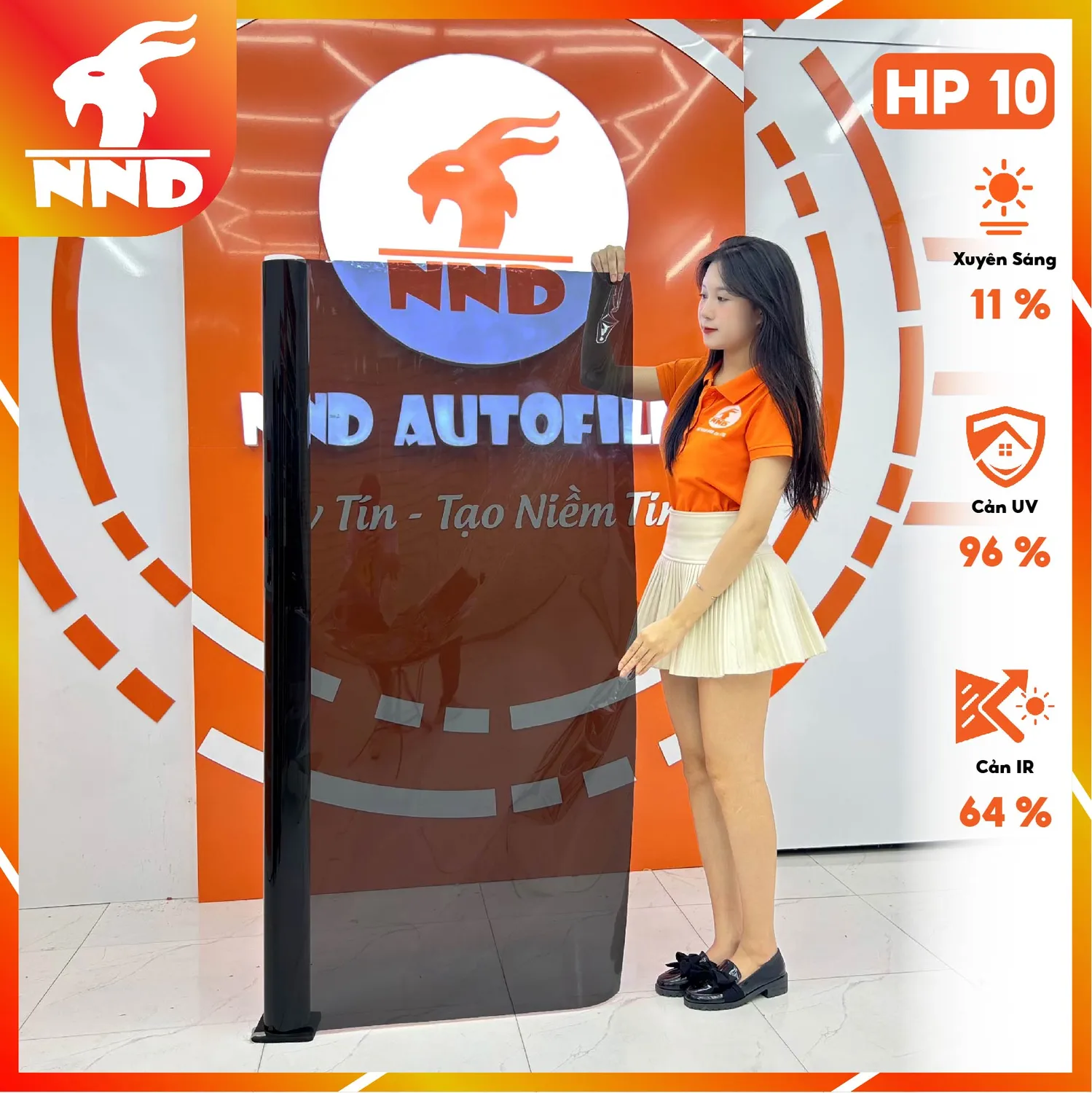 Mã HP10 là loại film cách nhiệt sử dụng công nghệ nano không chứa kim loại, giúp chất lượng sản phẩm không bị ăn mòn hay phai màu theo thời gian. Loại vật liệu này có khả năng chặn tia hồng ngoại và cản đi sức nóng trong ánh sáng mặt trời, giúp giảm được nhiệt độ phía bên trong. Đặc biệt, vì không chứa kim loại, phim HP10 hoàn toàn không cản sóng điện thoại, GPS, radio… và cho phép nhìn thấy từ cả 2 phía, đảm bảo an toàn trong quá trình tham gia giao thông, ngay cả vào ban đêm.