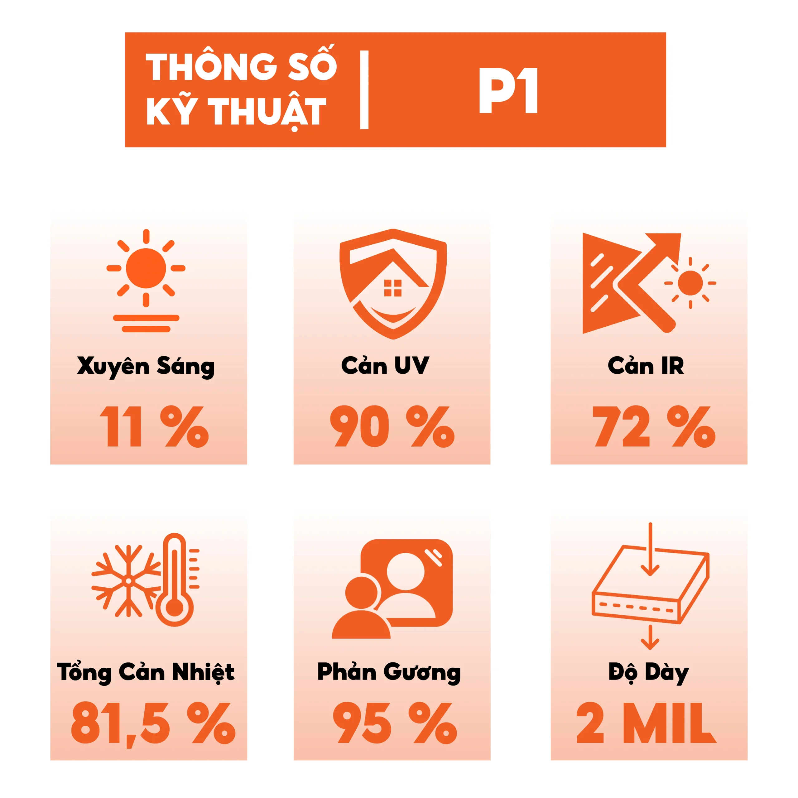 Đây không chỉ là những lời quảng cáo, mà là cam kết được chứng minh bằng những con số chính xác. Các thông số kỹ thuật của phim cách nhiệt P1 như độ xuyên sáng (11%), khả năng cản tia UV (90%), cản tia hồng ngoại (72%)… đều được đo đạc bằng máy móc chuyên dụng, đảm bảo tính chính xác và minh bạch. Mời quý khách xem chi tiết các thông số trên hình ảnh đính kèm để hiểu rõ hơn về khả năng bảo vệ ưu việt của sản phẩm.