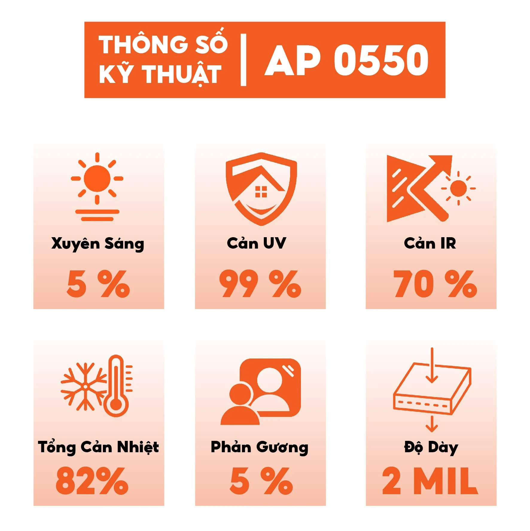 Những con số không biết nói dối. Hiệu suất đỉnh cao của AP 0550 được thể hiện qua các thông số kỹ thuật đã được kiểm chứng bằng máy móc chuyên dụng: Độ xuyên sáng (VLT) 5%, Chống UV (UVR) 99.9%, Chống hồng ngoại (IRR) 70%. Cấu trúc 2 lớp dày dặn (2ply/2mil) càng khẳng định vị thế của một sản phẩm cao cấp, bền bỉ.