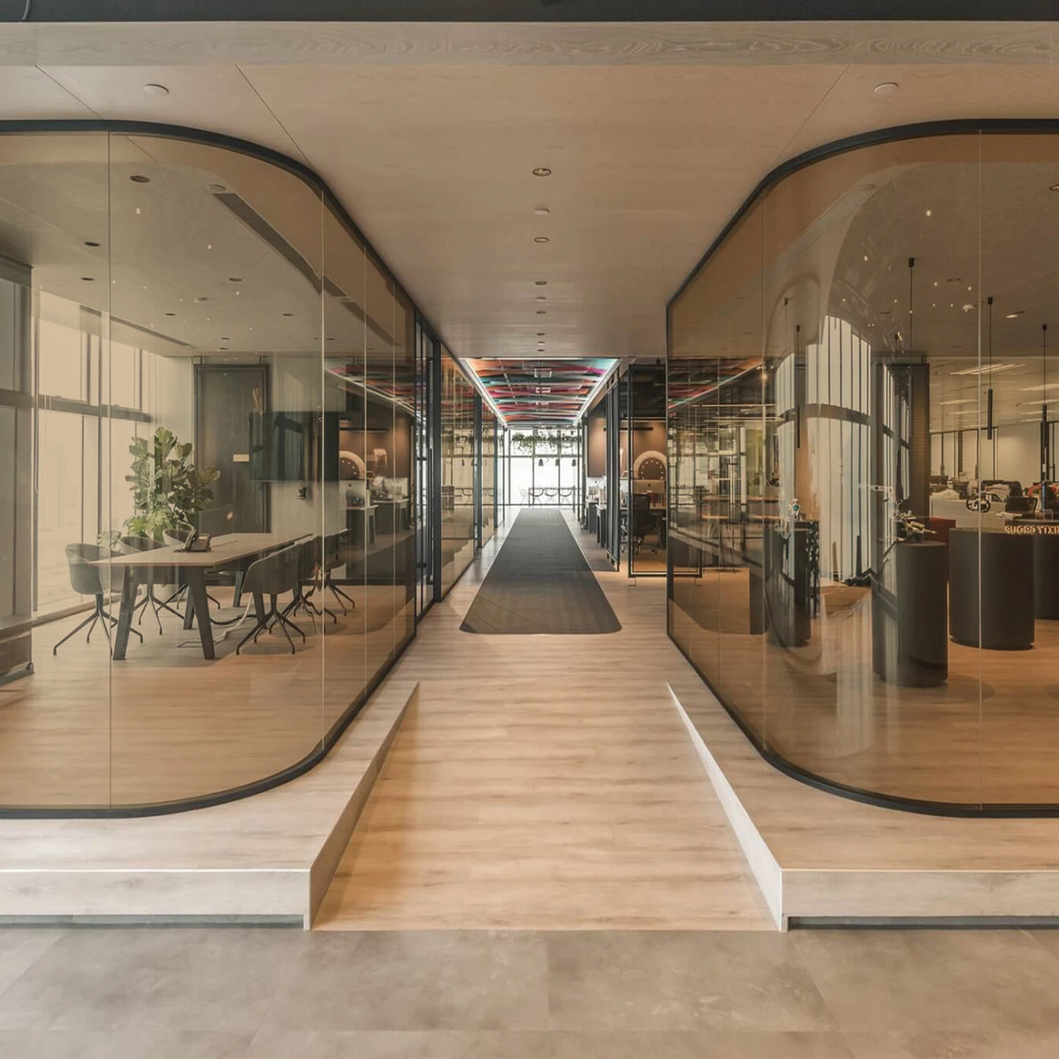 Phim màu tràm trên các vách kính cong tạo nên một hành lang văn phòng hiện đại, ấn tượng, vừa đảm bảo sự riêng tư vừa giữ được vẻ thông thoáng, mở rộng tầm nhìn.